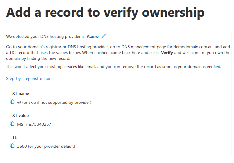 You’ll then be prompted with 3 options to validate the domain to prove to Microsoft that you own and have management capabilities over that domain. In this example, we’ll be looking at the first option, which is “Add a TXT record to the domain’s DNS records”. Select this option and click continue.