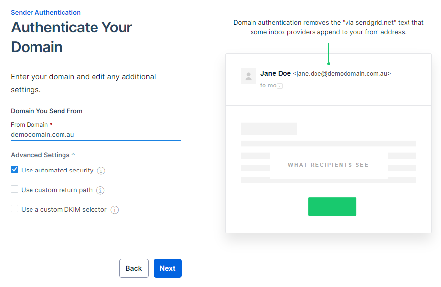 Use automated security. I recommend leaving this checked so SendGrid manage all the DKIM key rotation and everything for you. This isn’t really something you need to have to be worrying about.
